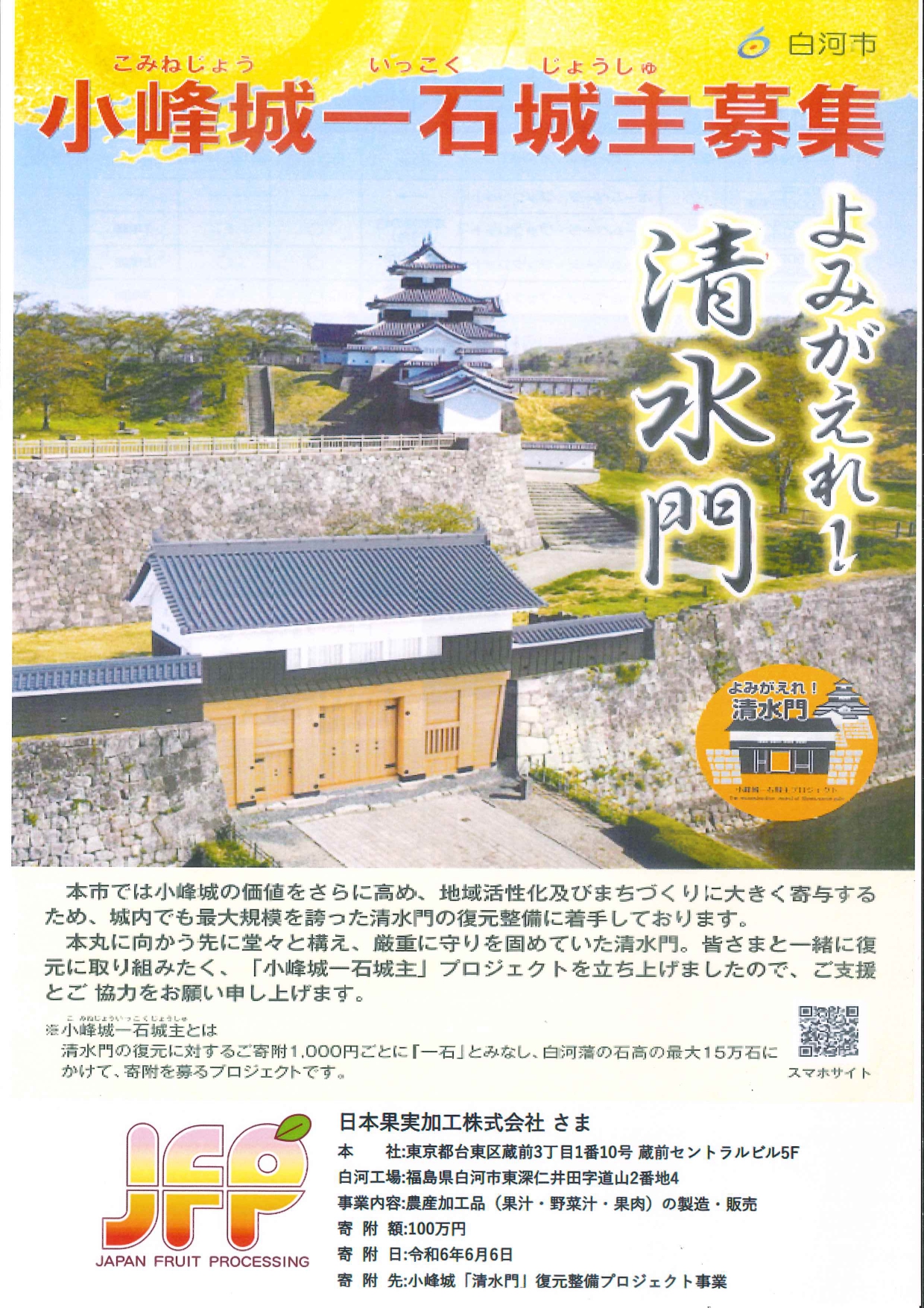 白河市が推進する「小峰城一石城主プロジェクト」を支援し、より多くの方々に白河市の歴史・文化を堪能していただくことを目的とし、寄付を実施いたしました。